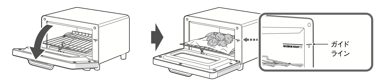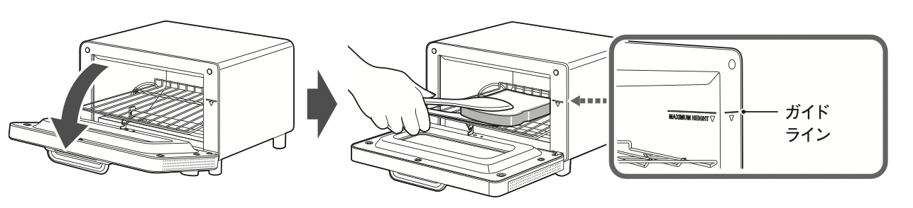 高さのあるパンや、厚切りパンなどに具材を多く乗せる場合、器を用いた調理の際は、庫内のガイドラインを目安にご使用ください。